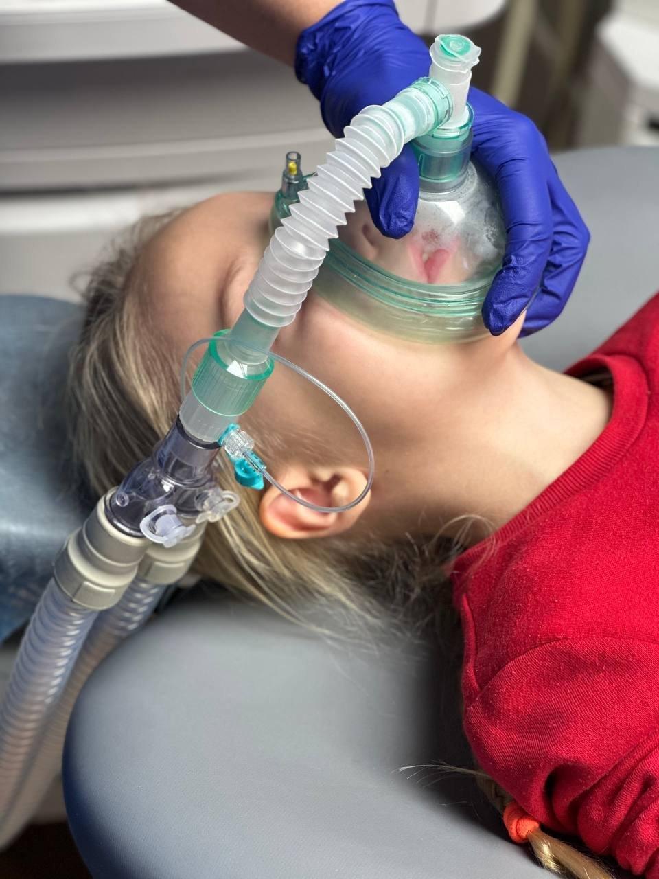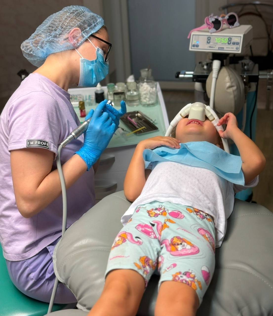 Лікування із застосуванням закису азоту – це сучасний і безпечний метод знеболення, який іноді використовується як альтернатива традиційному наркозу. Закис азоту (звеселяючий газ) має легкий седативний ефект, дитина під час лікування перебуває у свідомості, у розслабленому стані. Цей метод допомагає зменшити біль та страх. Малюк вдихає спеціальну суміш газів, що робить лікування комфортним та безстресовим. Цей метод є абсолютно безпечним, оскільки концентрація газу дбайливо контролюється лікарем.