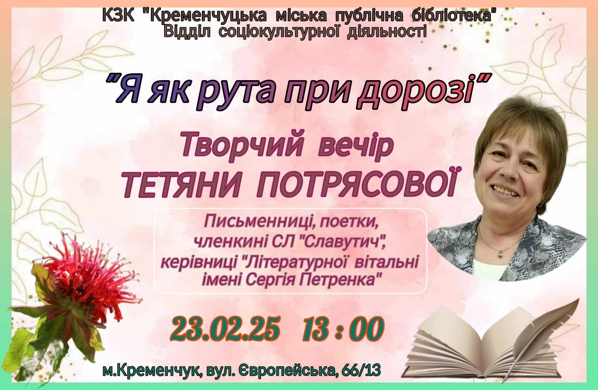 У неділю, 23 лютого, кременчужан кличуть до бібліотеки на літературний вечір місцевої поетки Тетяни Потрясової. Про проведення заходу журналістам повідомили організатори.