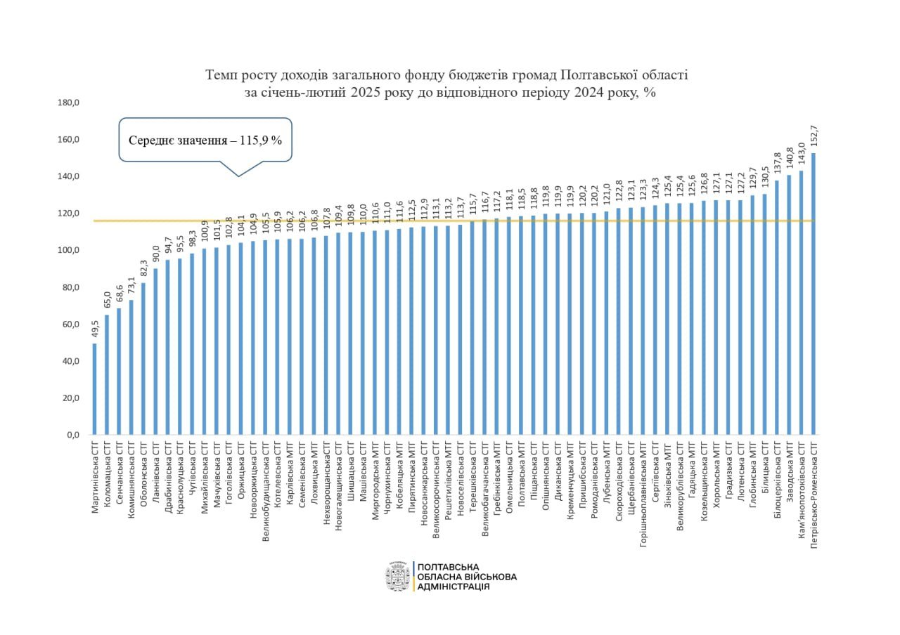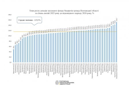 Дохідна частина загального фонду бюджету Кременчуцької міської територіальної громади за січень-лютий 2025 року збільшився у порівнянні з аналогічним періодом минулого року на 19,9%, що вище середнього показника по області у 15,9%.