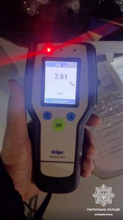 Під час складання адміністративних матеріалів та спілкування інспектори помітили у водія ознаки алкогольного сп’яніння та запропонували пройти огляд. Тест на Драгер показав 2.61‰ – більш ніж у 13 разів перевищений допустимий рівень. Чоловік визнав результат й отримав ще один протокол – за ч.1 ст. 130 КУпАП.