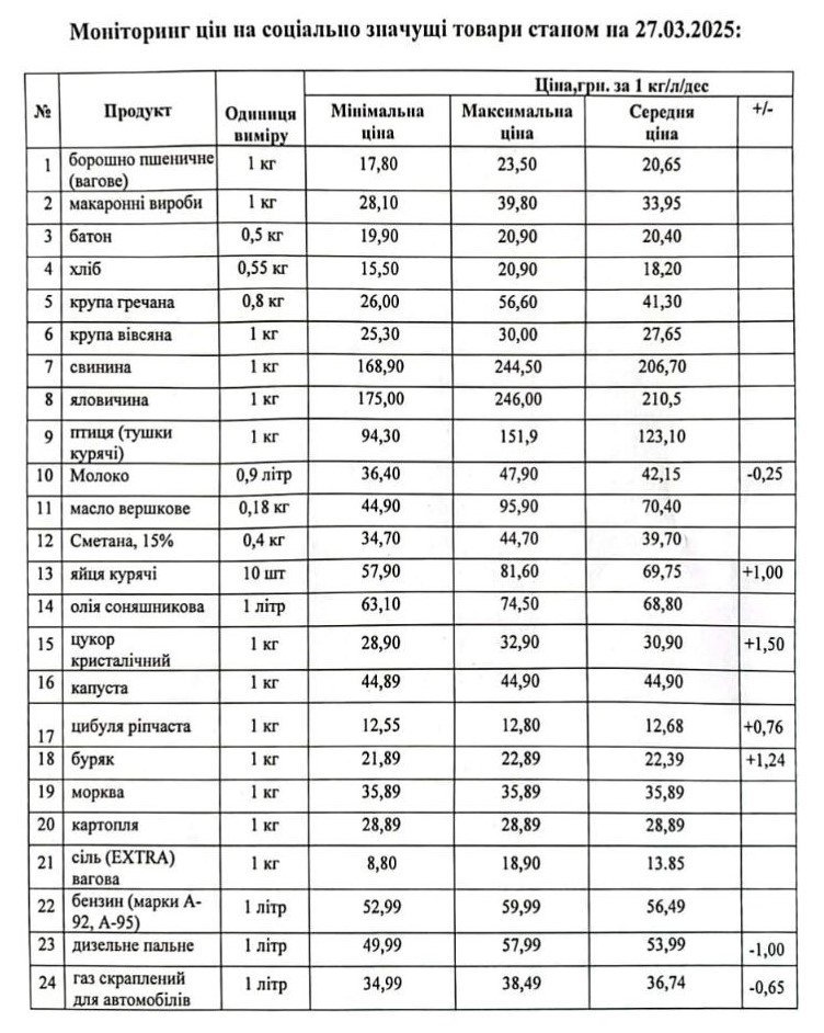 Кременчуцьке районне управління Держпродспоживслужби провело моніторинг цін на соціально значущі товари у торгівельних закладах району станом на 27 березня. З цією інформацією наше видання ознайомила Кременчуцька районна військова адміністрація.
