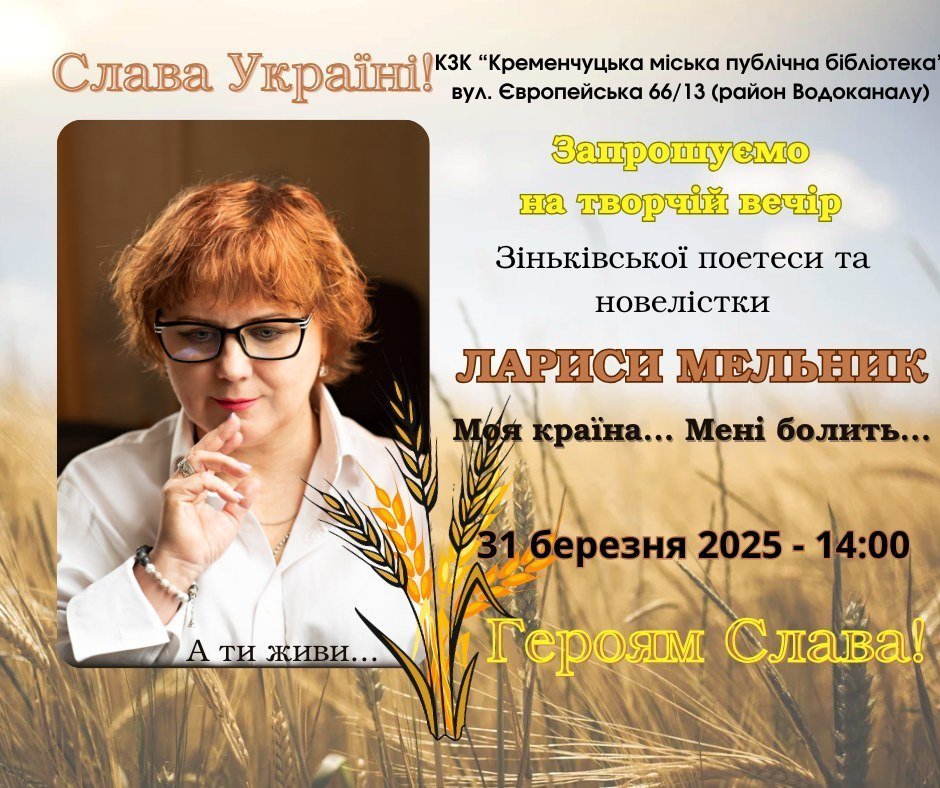 У понеділок, 31 березня, у Кременчуцькій міській публічній бібліотеці відбудеться творчий вечір Лариси Мельник «Моя країна… Мені болить…». Формат заходу включає поетичні читання, музичний виступ, обговорення та презентацію творчості авторки. Про це повідомили на Фейсбук-сторінці Кременчуцької міської ради.