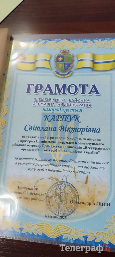 Нагадаємо, «Кременчуцький Телеграф» нещодавно розповідав про Світлану Карпук. Жінка має другу групу інвалідності, але це не завадило їй стати успішною спортсменкою, чемпіонкою України і Європи. В колекції її медалей — нагороди за перемогу в змаганнях, що проходили в Ірландії, Греції, Нідерландах, Туреччині та інших країнах світу. Вона стала чемпіонкою України, пізніше чемпіонкою Європи. Зараз Світлані Карпук 56 років, але вона продовжує брати участь і у місцевих змаганнях з настільного тенісу. Коли запрошують — не відмовляється!