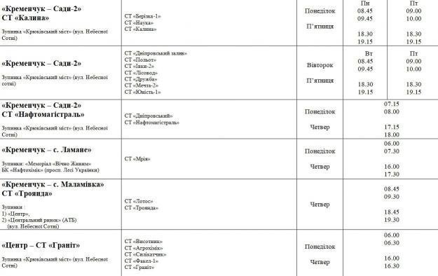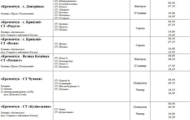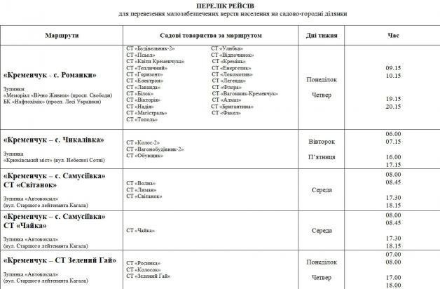 Кременчуцька міська рада надала графіки автобусів, які возитимуть безоплатно пільгові категорії населення до дач. Загалом автобусні перевезення здійснюватимуться за 17 різними напрямками та охоплюватимуть 75 садових товариств.