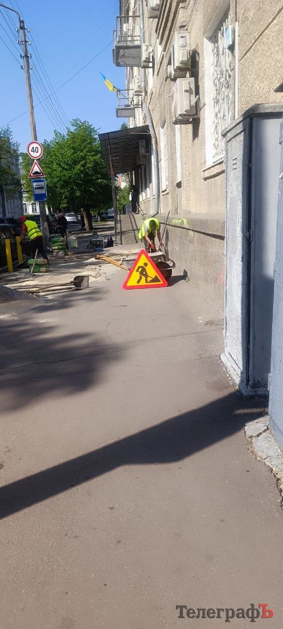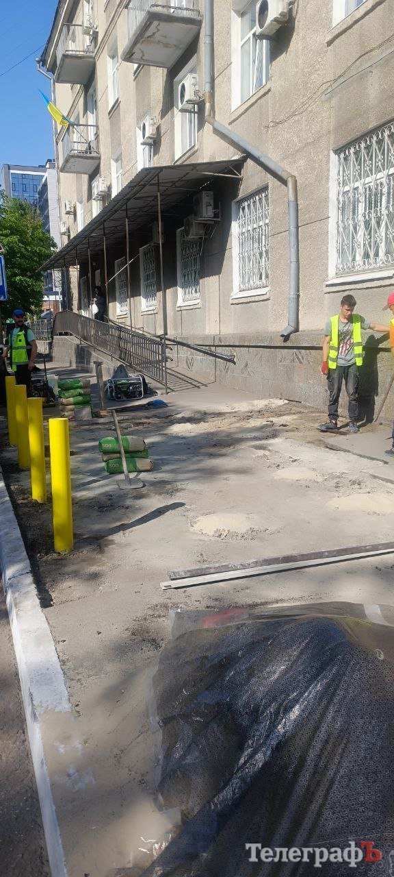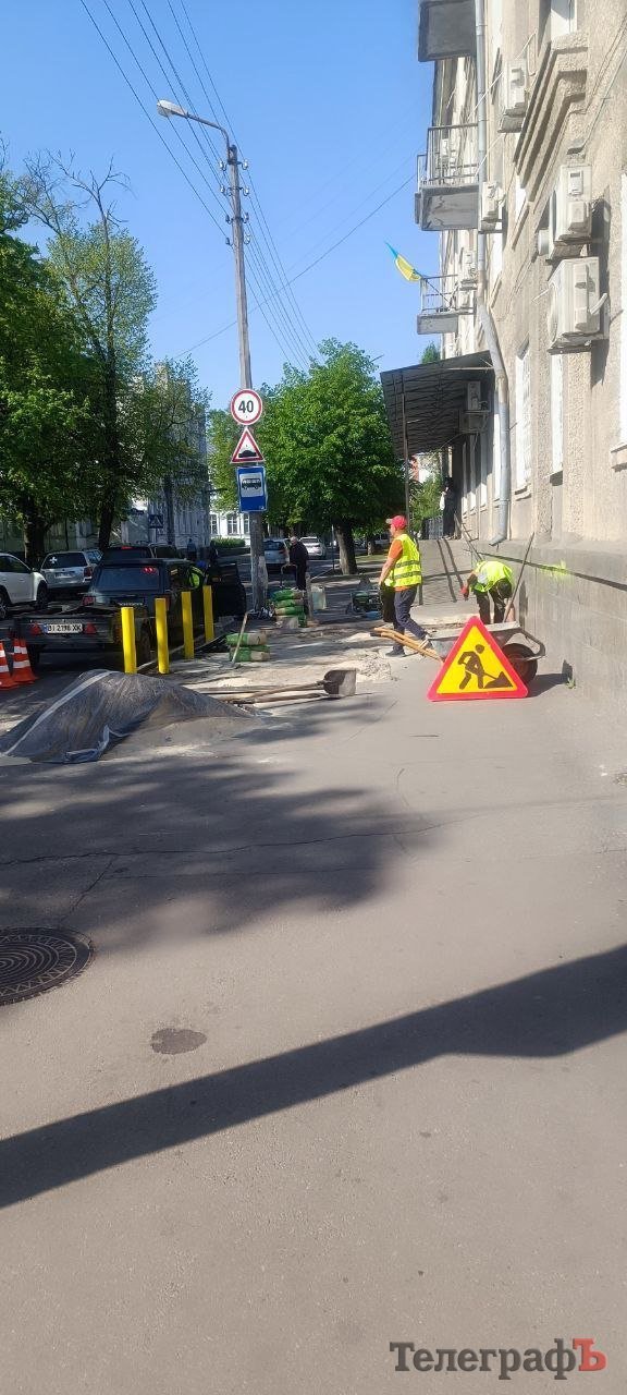 Ремонтують зупинку, ймовірно, працівники підрядника — ФОП Ганна Бєлкіна. За даними Clarity Project, Бєлкіна має 54 договори з кременчуцькими розпорядниками бюджету на загальну суму 6 млн гривень.