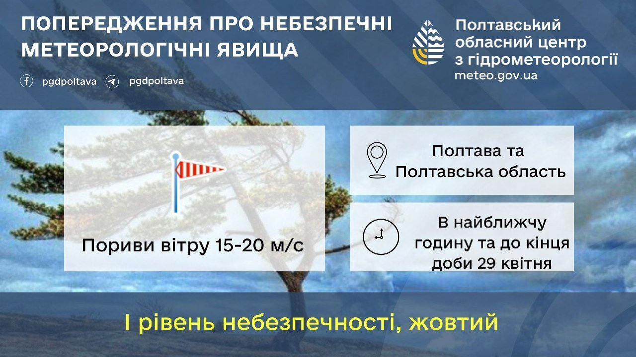 Сьогодні, 29 квітня, до кінця доби у Кременчуці та на Полтавщині очікуються сильні пориви вітру. Про це інформують у пресслужбі Полтавського обласного гідрометцентру.