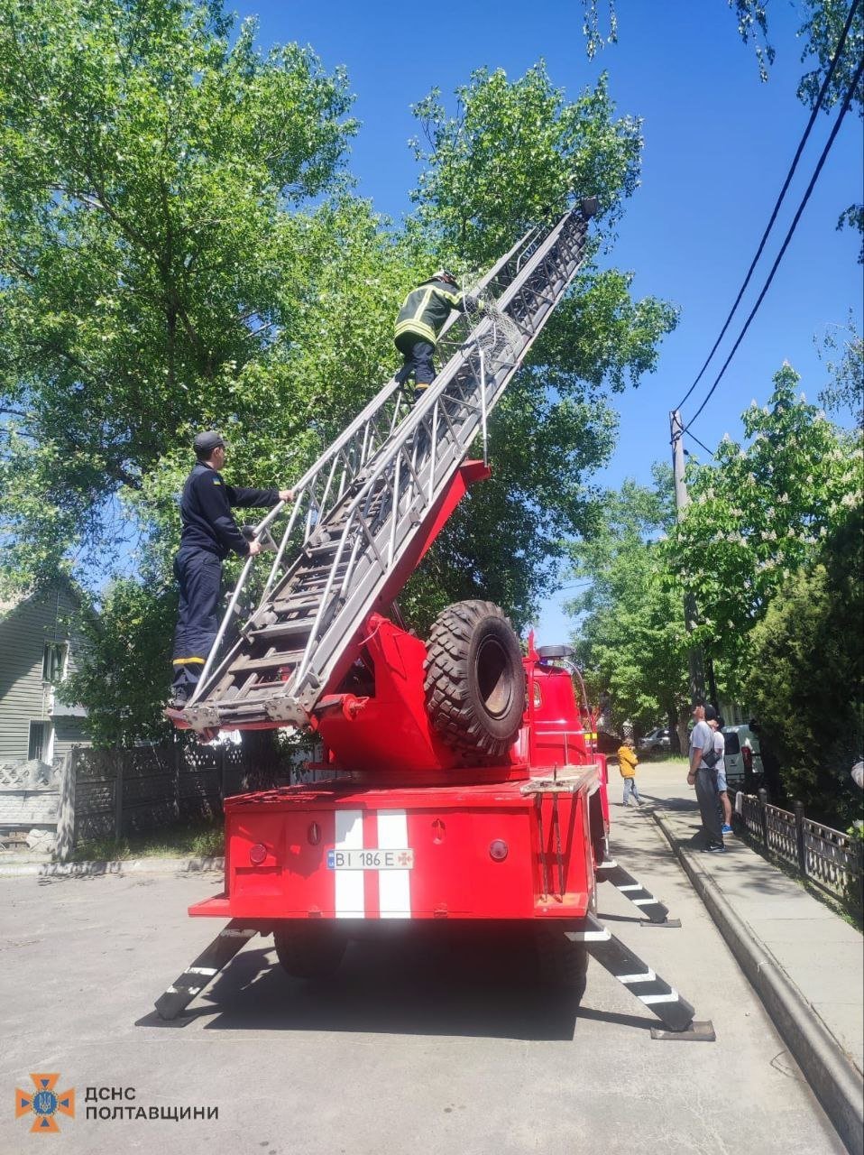 У Горішніх Плавнях інший кіт застряг на дереві й не міг самостійно злізти. На виклик прибули працівники ДСНС, які за допомогою автодрабини дісталися до тварини, зняли її з гілки та передали господарці.