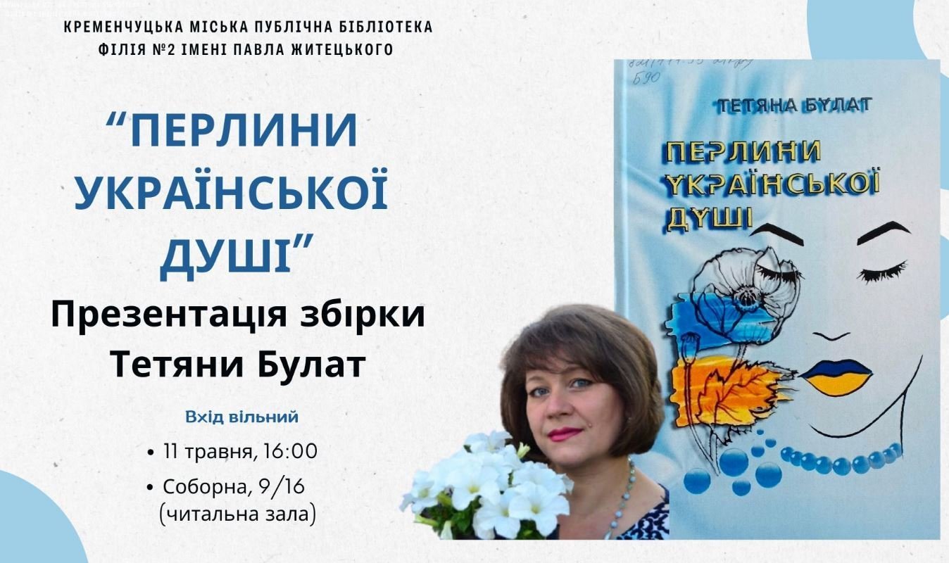 Талановита кременчуцька поетеса й публіцистка Тетяна Булат й читальна зала філії №2 Кременчуцької міської публічної бібліотеки запрошує на презентацію двотомного видання авторки «Перлини української душі».