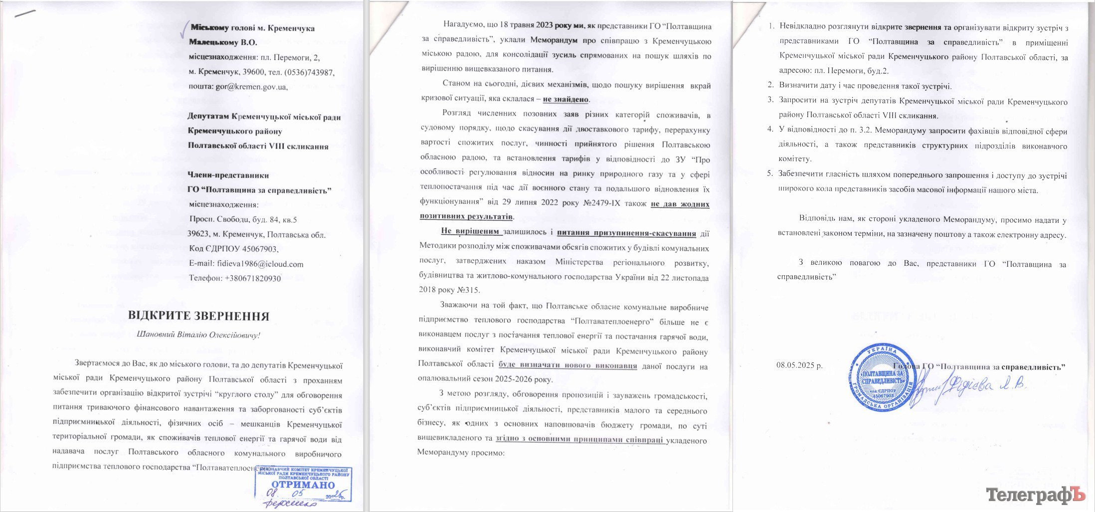 Представники ГО «Полтавщина за справедливість» звернулися до міського голови Кременчука Віталія Малецького та депутатів міськради з проханням організувати відкриту зустріч «круглого столу». Мета — обговорити тарифну ситуацію з постачання теплової енергії та гарячої води, а також вибір нового виконавця послуг на опалювальний сезон 2025–2026 років.
