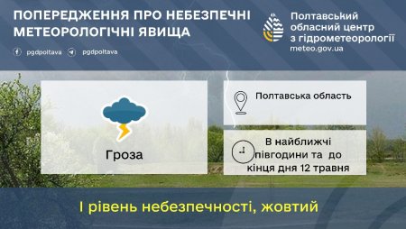 Сьогодні, 12 травня, до кінця доби синоптики попереджають про небезпечні метеорологічні явища у Кременчуці та на Полтавщині: в області очікуються грози. Про це інформують у пресслужбі Полтавського обласного гідрометцентру.