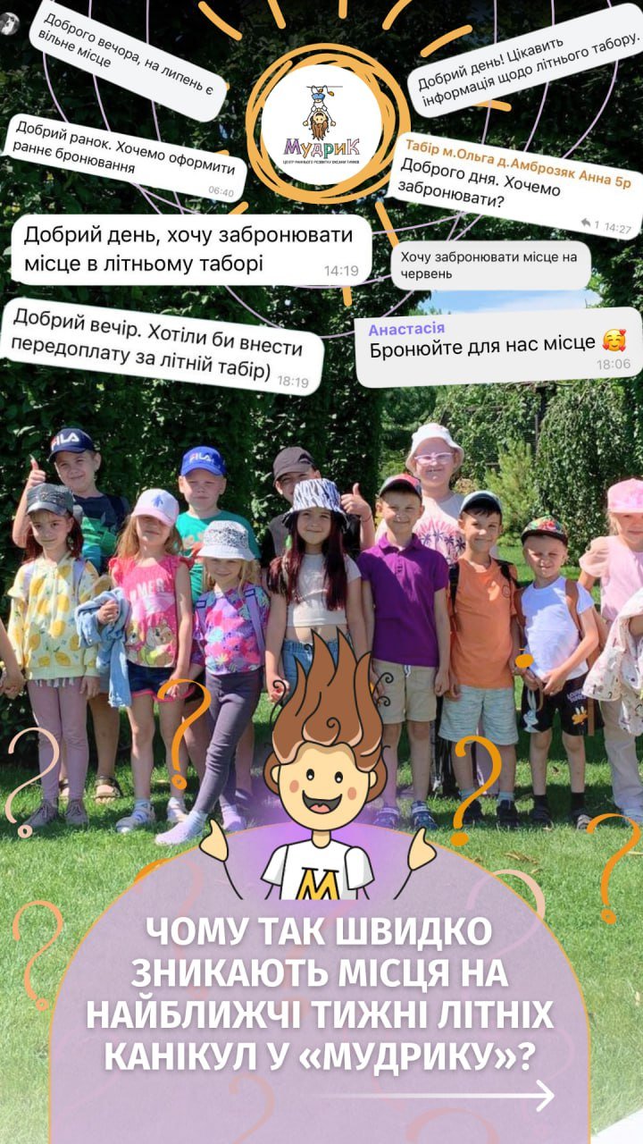 Якщо ви досі не забронювали яскраве та цікаве літо у «Мудрику» для своєї дитини — радимо поспішати, бо до 22 травня діє знижена ціна раннього бронювання: