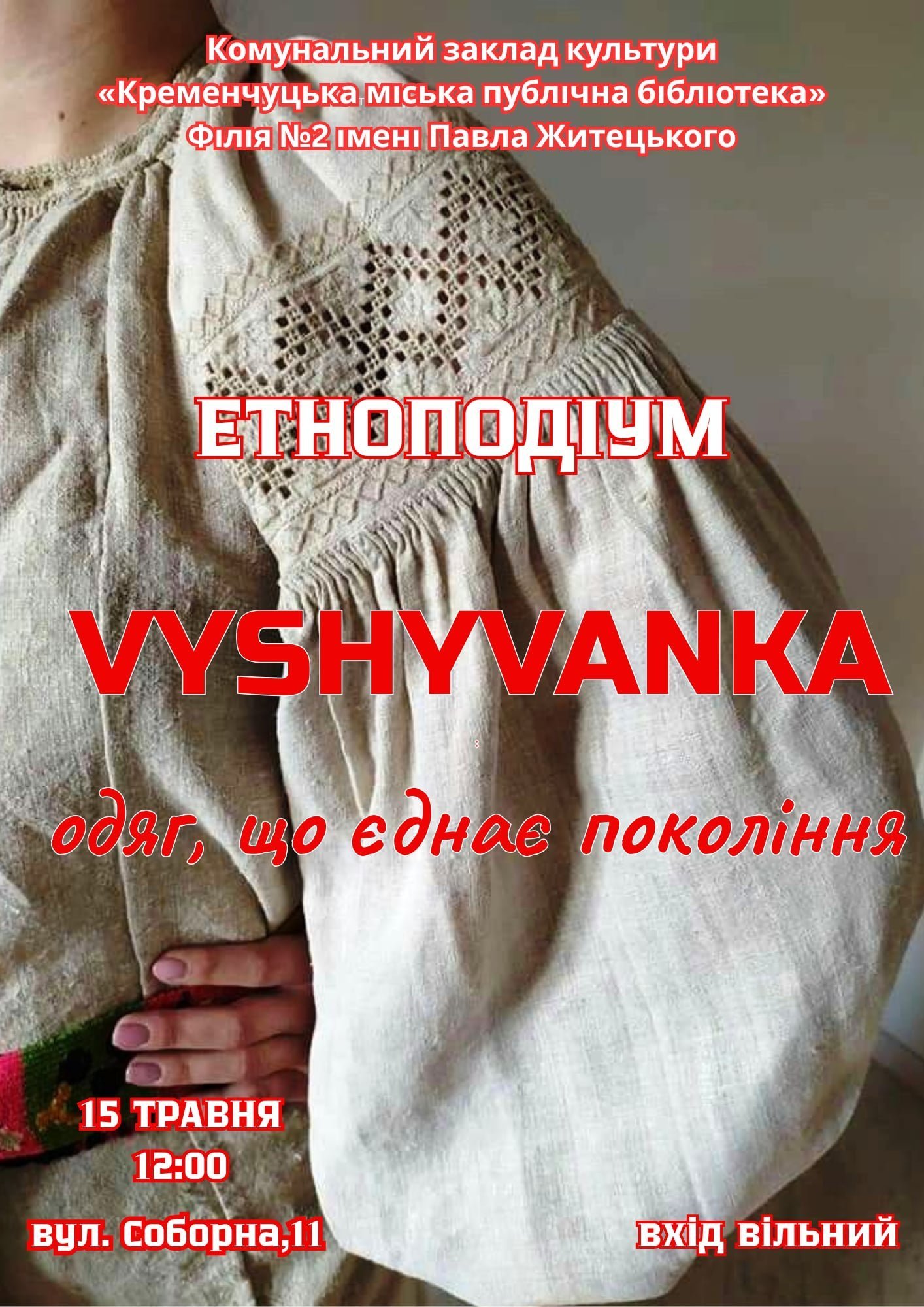 У четвер, 15 травня, усіх охочих кличуть до бібліотеки на захід з нагоди Дня вишиванки — етноподіум «Вишиванка: одяг, що єднає покоління». Про проведення заходу журналістам «Кременчуцького Телеграфа» повідомили його організатори.