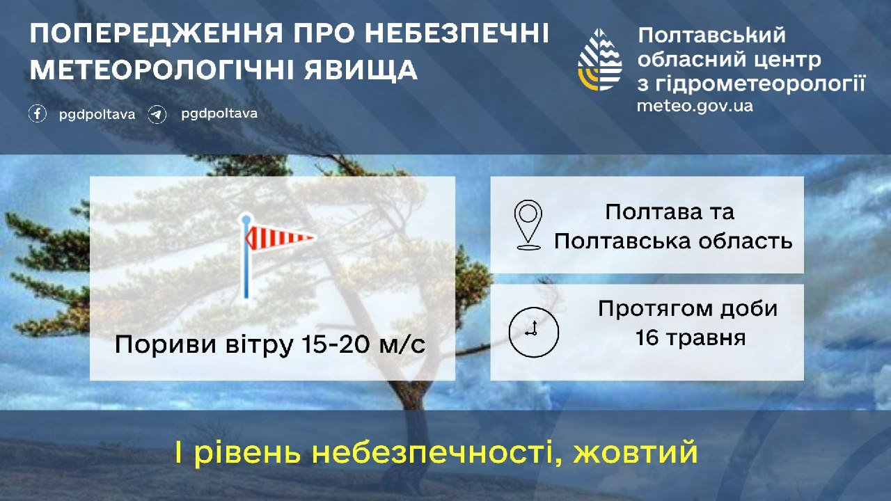 Завтра, 16 травня, протягом доби у Кременчуці та на Полтавщині очікуються сильні пориви вітру. Про це інформують у пресслужбі Полтавського обласного гідрометцентру.