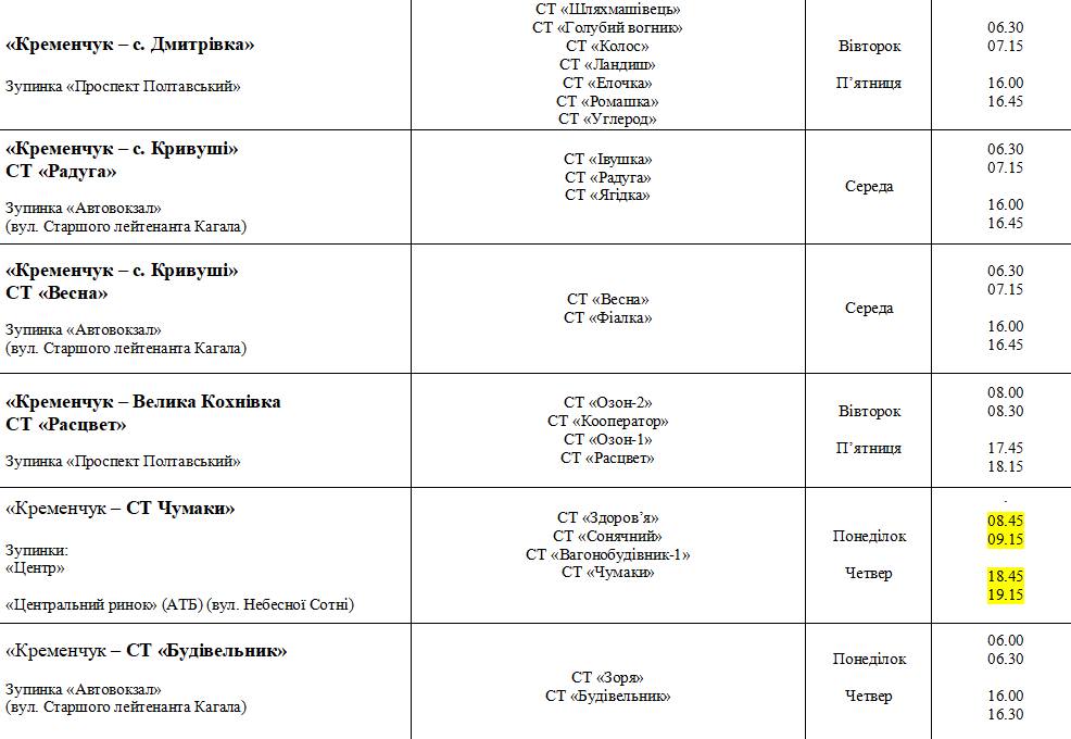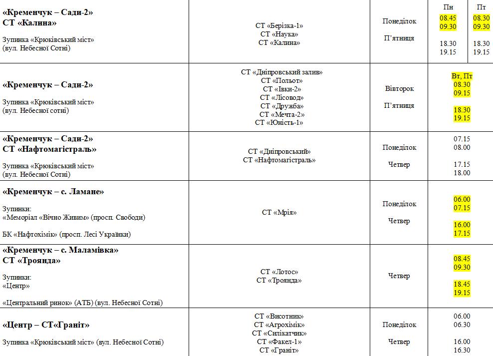 Повний перелік рейсів з датами, зупинками, садовими товариствами та графіком руху можна переглянути у прикріплених таблицях: