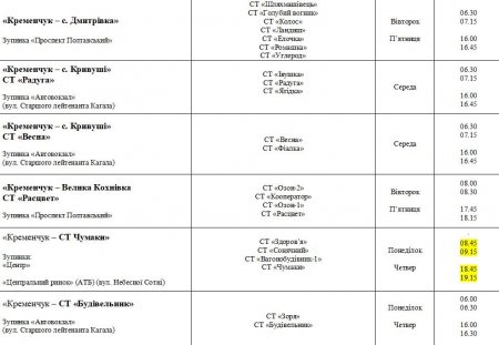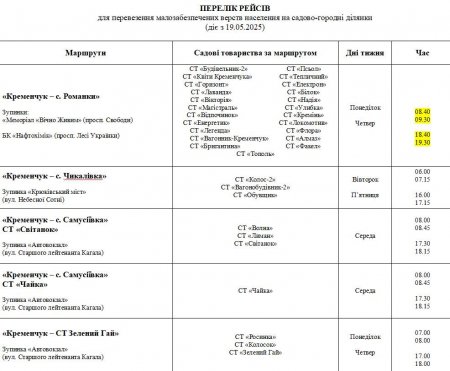 Із 19 травня у Кременчуцькій громаді діятиме оновлений графік руху соціальних автобусів до садово-городніх товариств. Про це повідомила пресслужба міськради.