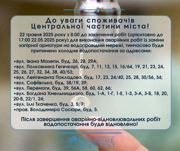 КП «Кременчукводоканал» інформує, що у четвер, 22 травня, з 8.00 і до закінчення робіт (орієнтовно 17.00) для виконання аварійних робіт із заміни запірної арматури на водопровідній мережі, тимчасово буде припинено холодне водопостачання за адресами: