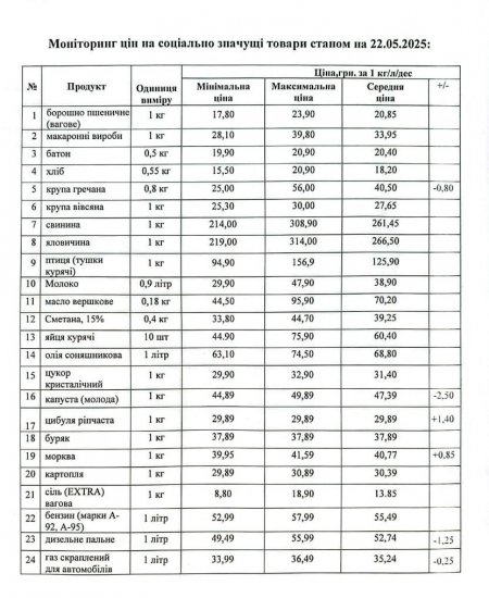 Кременчуцьке районне управління Держпродспоживслужби провело моніторинг цін на соціально значущі товари у торгівельних закладах району станом на 22 травня. З цією інформацією наше видання ознайомила Кременчуцька районна військова адміністрація.