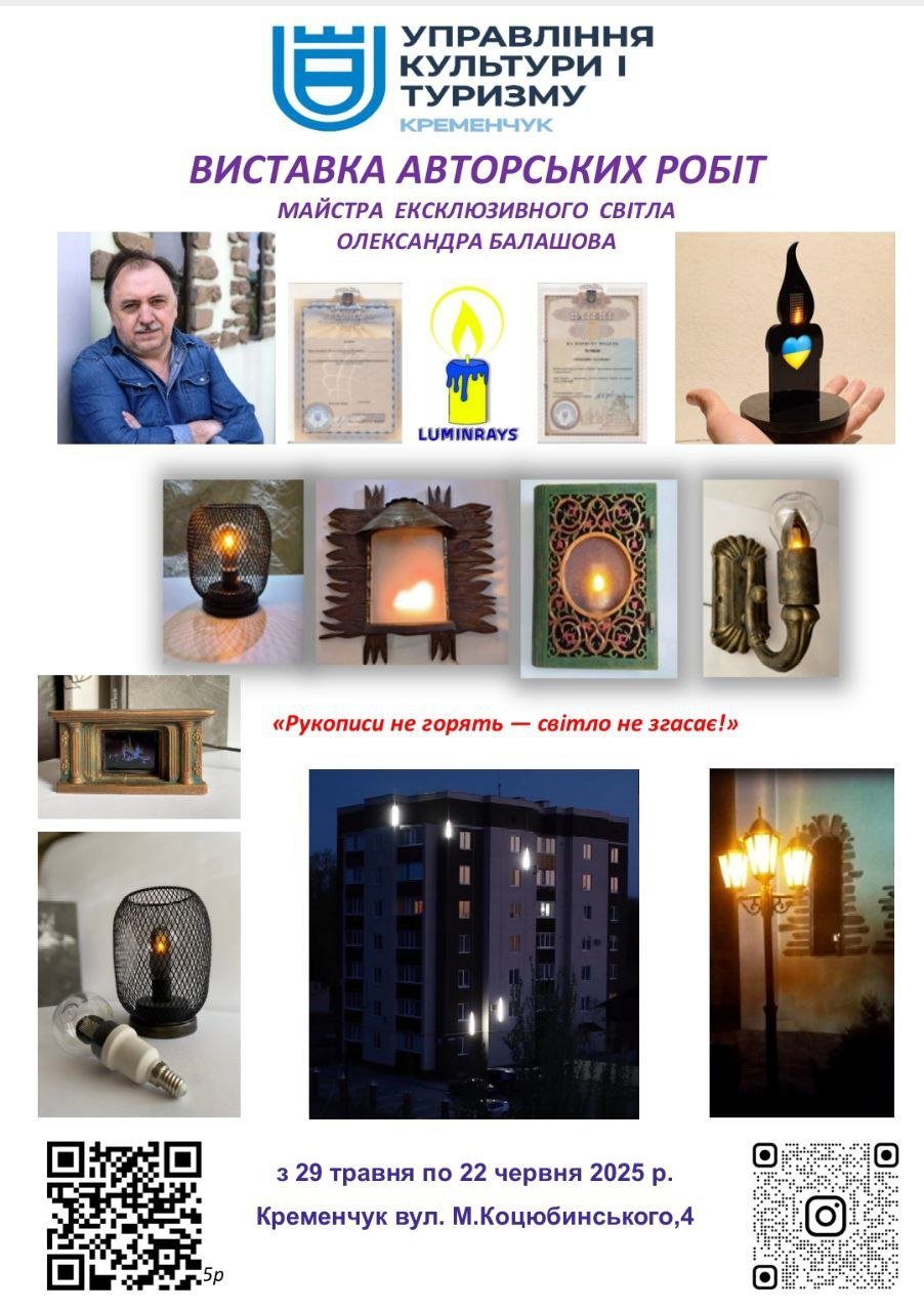 29 травня о 14.00 у малій залі Кременчуцької міської художньої галереї (вул. Михайла Коцюбинського, 4) відкриється виставка авторських робіт Олександра Балашова під назвою «Рукописи не горять, світло не згасає».