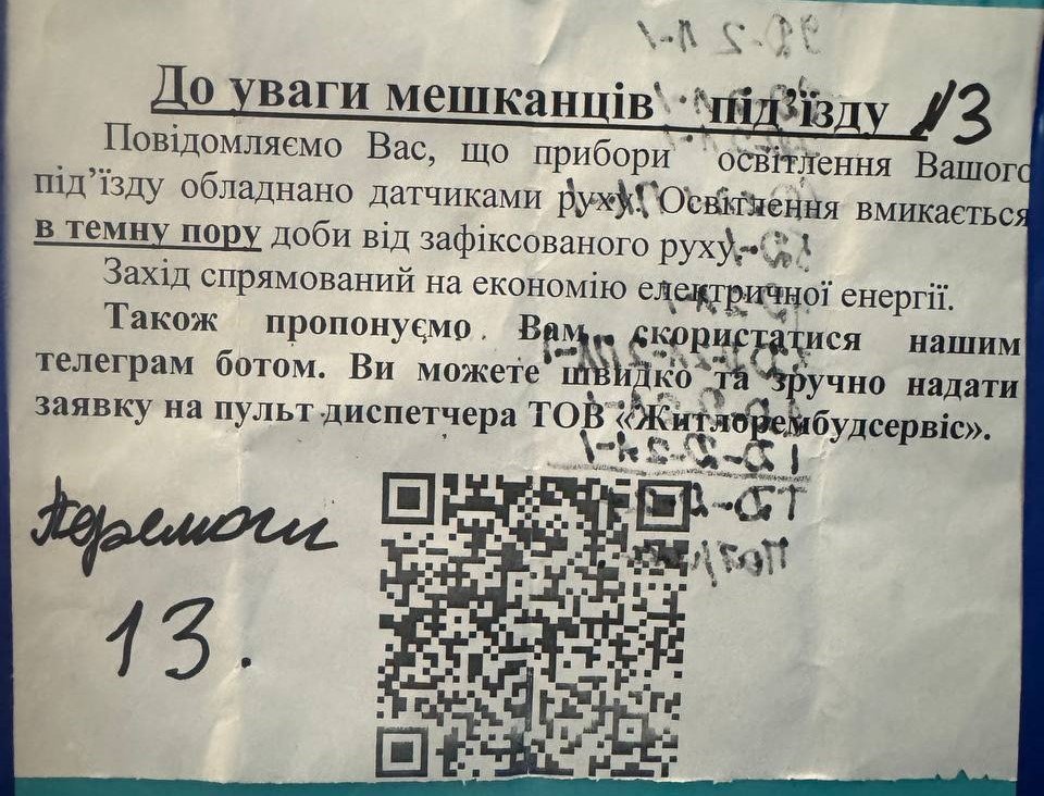 Крім того, вона не вміє користуватися QR-кодом з посиланням на телеграм-бот, який керуюча компанія розмістила на оголошенні про встановлення нових світильників з датчиками руху. Та не розуміє, навіщо це потрібно і що воно дає.