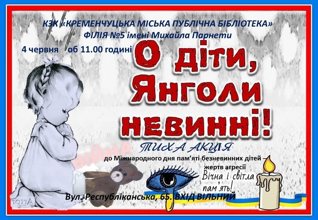 Завтра, 4 червня, у приміщенні філії №5 Кременчуцької міської публічної бібліотеки відбудеться тиха акція пам’яті «О діти, янголи невинні!». Про проведення заходу журналістам «Кременчуцького Телеграфа» повідомили працівники бібліотеки.
