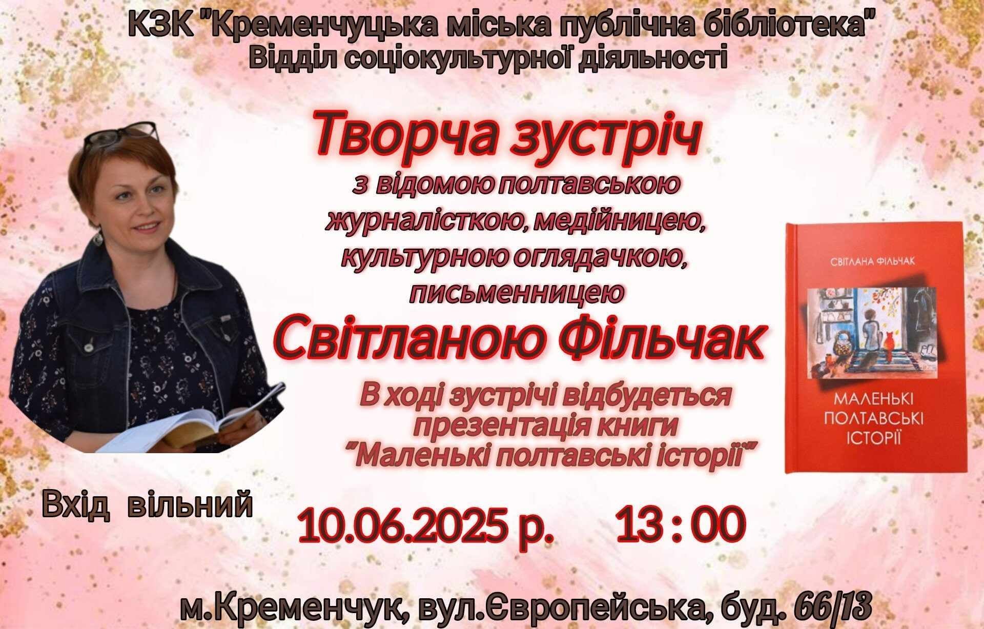 Жителів Кременчука та гостей міста кличуть завтра, 10 червня, до бібліотеки на презентцію дебютної книги «Маленькі полтавські історії» полтавської письменниці Світлани Фільчак. Про захід журналістам «Кременчуцького Телеграфа» повідомили працівники бібліотеки.