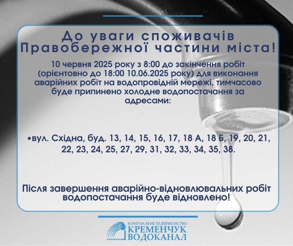 Для отримання оперативної інформації можна звертатись у диспетчерську службу КП «Кременчукводоканал» за телефонами: