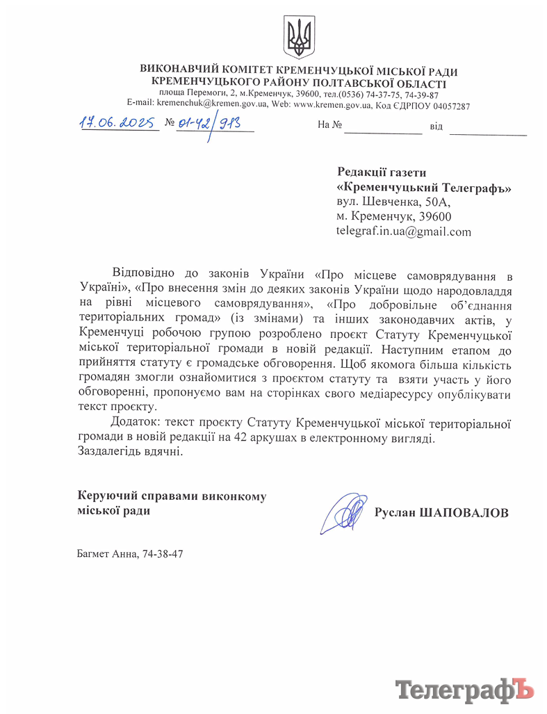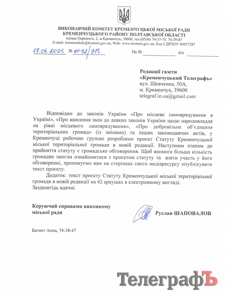 Редакція «Кременчуцького Телеграфа» отримала офіційного листа від виконавчого комітету Кременчуцької міської ради з проханням оприлюднити проєкт нового Статуту Кременчуцької міської територіальної громади. Як зазначено в листі, документ розроблено робочою групою відповідно до чинного законодавства, зокрема законів «Про місцеве самоврядування», «Про народовладдя» та «Про добровільне об’єднання територіальних громад».