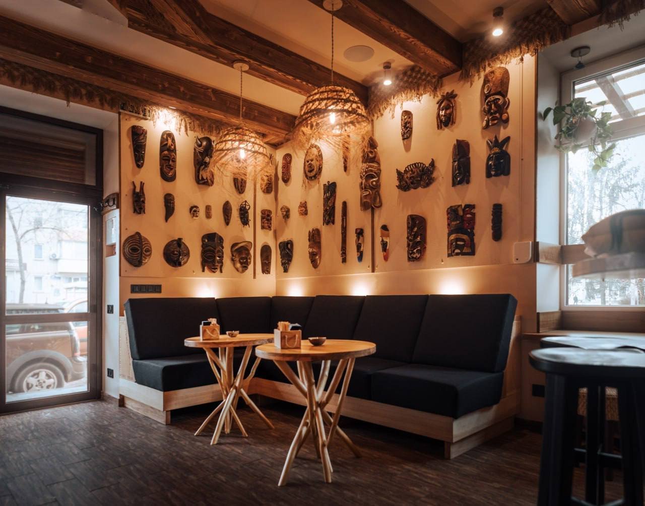 Унікальний інтер’єр із колекцією справжніх масок з усього світу: Африка, Південна Америка, Азія… Тут навіть кава смакує інакше — насичено, глибоко, по-особливому.