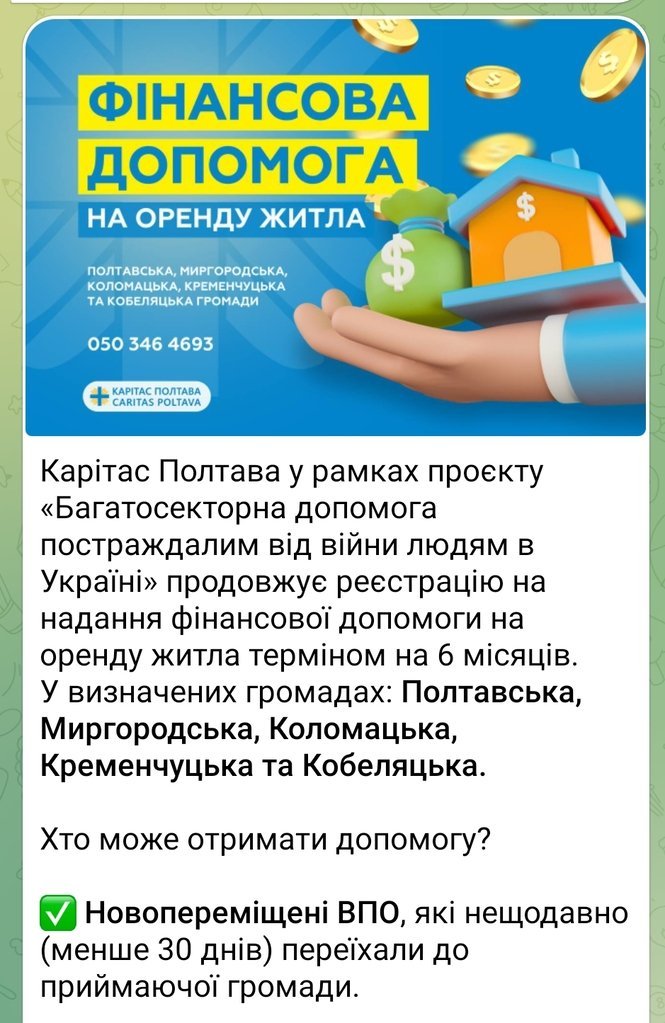 Благодійний фонд «Карітас. Полтава» запрошує українців зареєструватися для отримання грошової допомоги на оренду житла на 6 місяців. Грошова підтримка надається в межах проєкту «Багатосекторна допомога постраждалим від війни людям в Україні». Про це повідомляє видання «На пенсії».