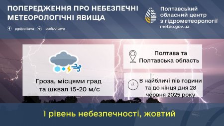 Полтавський обласний центр з гідрометеорології попереджає про небезпечні метеорологічні явища. В найближчі пів години та до кінця дня 28 червня на території Полтавської області очікуються грози, місцями шквали 15-20 м/с та град (6-19 мм).
