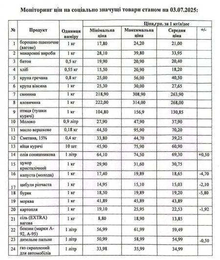 Кременчуцьке районне управління Держпродспоживслужби провело моніторинг цін на соціально значущі товари у торгівельних закладах району станом на 3 липня. З цією інформацією наше видання ознайомила Кременчуцька районна військова адміністрація.