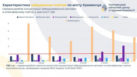 З 30 червня по 5 липня у Кременчуці фіксували перевищення гранично допустимих концентрацій (ГДК) окремих шкідливих речовин у повітрі. Про це 8 липня повідомив Полтавський обласний центр з гідрометеорології.