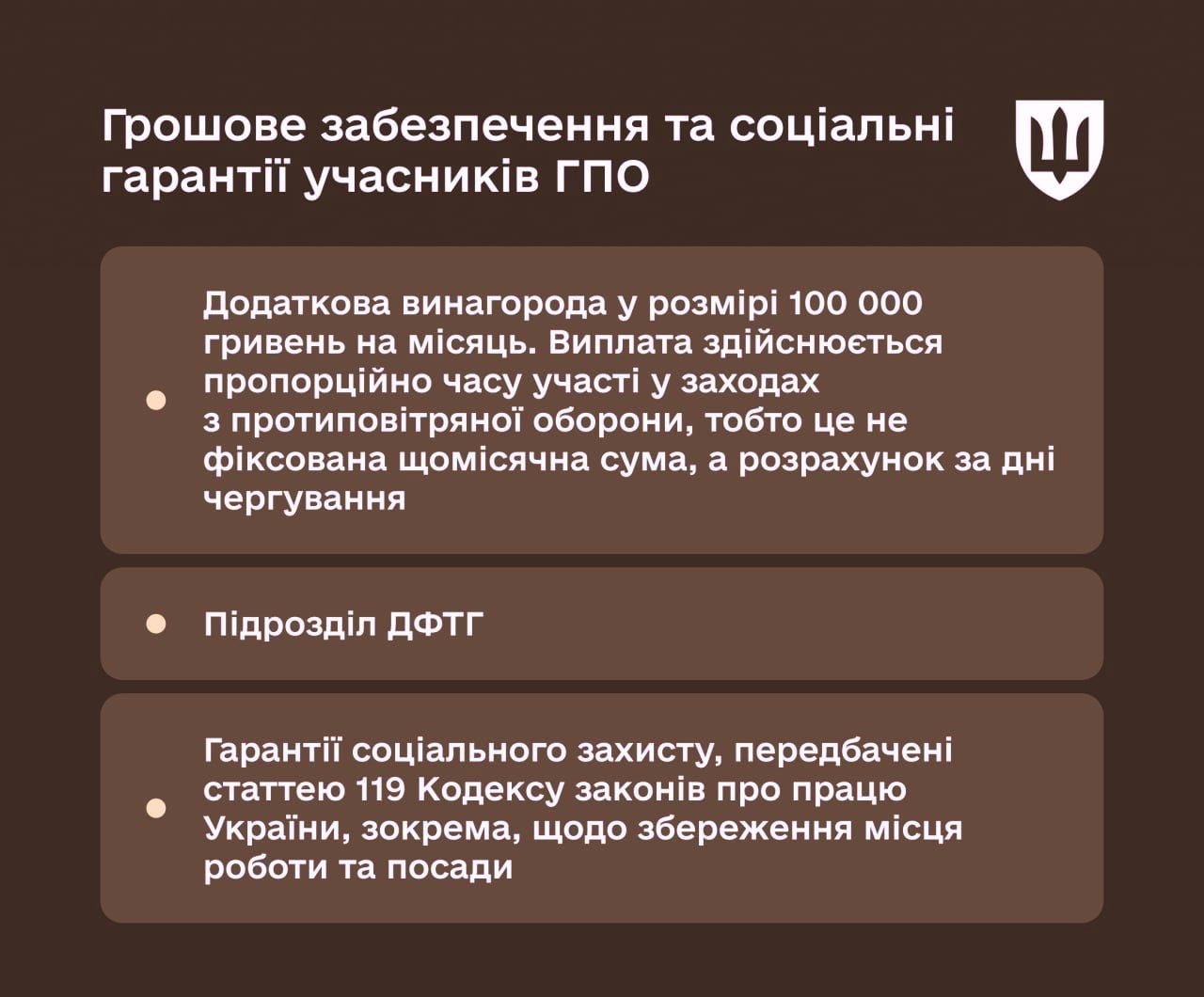 Учасники ГПО мають право на отримання додаткової винагороди у розмірі 100 000 грн на місяць. Виплата здійснюється пропорційно часу участі у заходах з протиповітряної оборони, тобто це не фіксована щомісячна сума, а розрахунок за дні чергування.