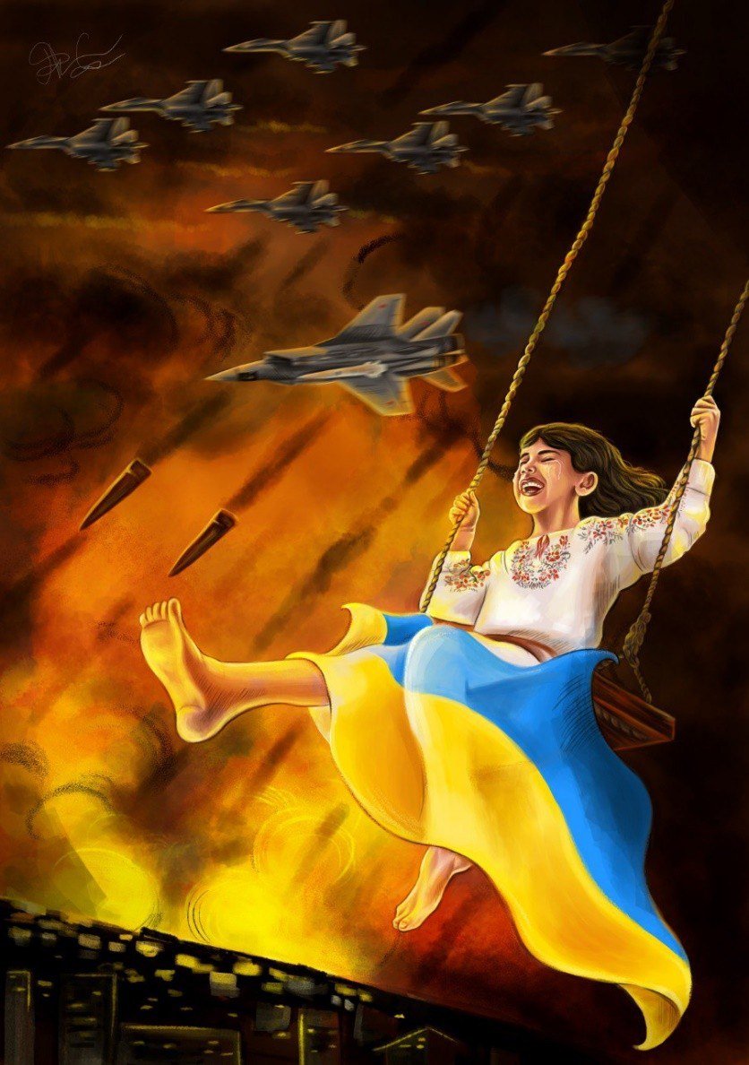 Маленька дівчинка злітає вгору на гойдалці, її обличчя осяяне щирою дитячою усмішкою, але з очей течуть сльози. Небо розривають ракети та російські винищувачі. Цей контраст між дитячою безтурботністю і війною — болісне відображення української реальності. Майстерно передані почуття тривоги, розпачу і, водночас, надії. Бо дитина символізує життя, яке триває попри вибухи.