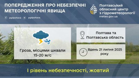 Завтра, 21 липня, у Кременчуці та на Полтавщині упродовж дня очікується погіршення погодних умов — синоптики прогнозують грози, місцями шквали. Такі дані надають у Полтавському обласному гідрометцентрі.