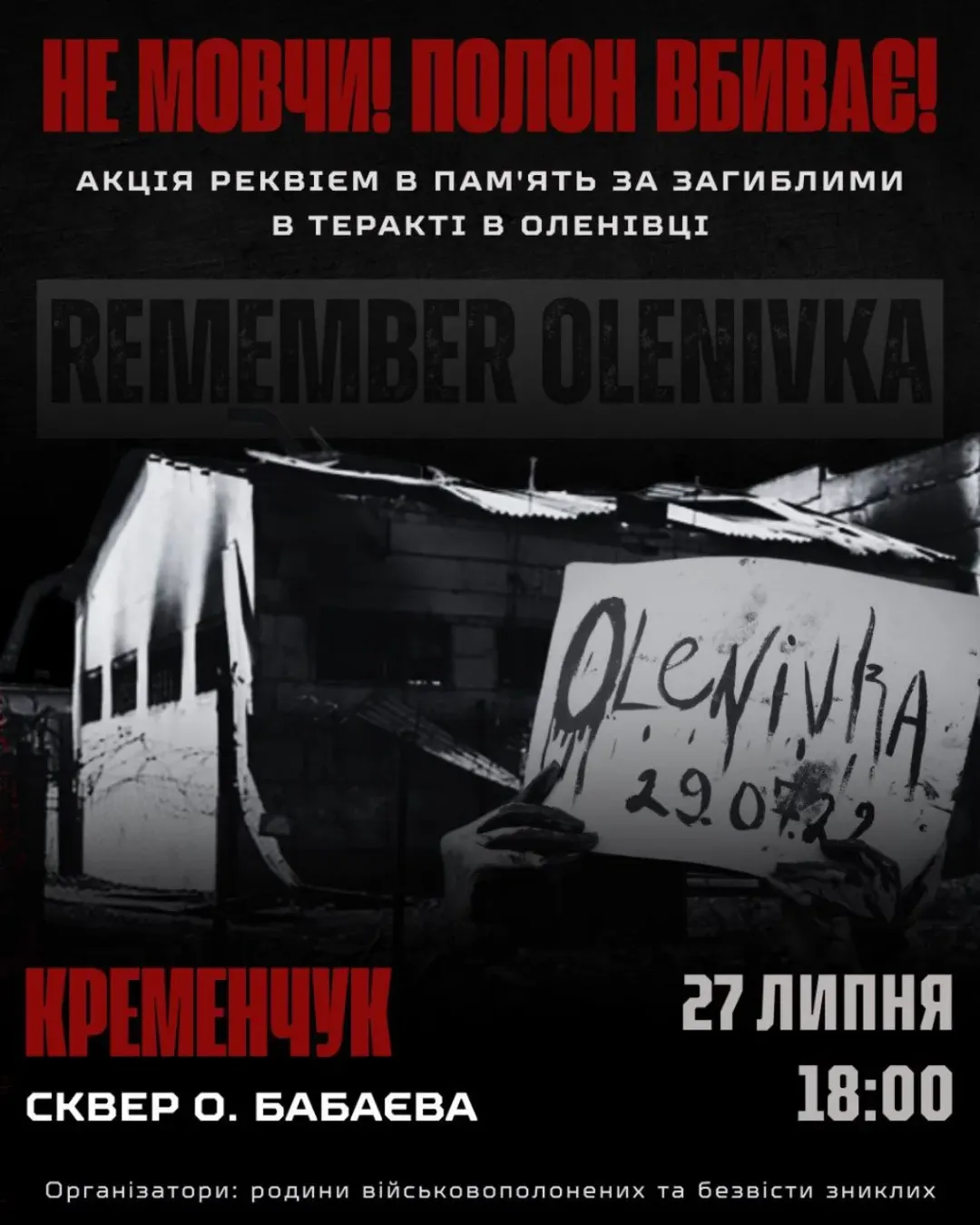 У неділю, 27 липня, у Кременчуці організовують акцію у пам’ять загиблих під час теракту військ РФ у Оленівці. Захід розпочнеться о 18.00 в сквері імені Олега Бабаєва. Про це повідомили на Instagram-сторінці azovstalfamilies_kremenchug.