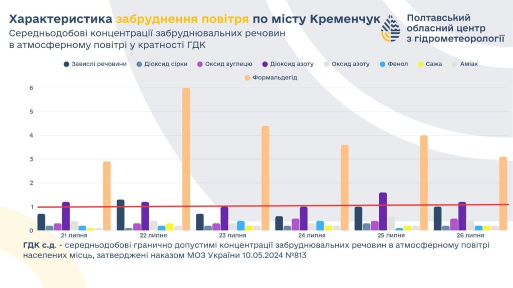 З 21 по 26 липня у Кременчуці зафіксовано перевищення середньодобових концентрацій кількох шкідливих речовин в атмосферному повітрі. Про це повідомив Полтавський обласний центр з гідрометеорології.