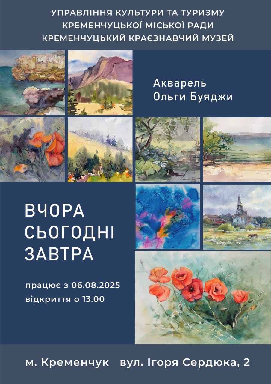 Завтра, 6 серпня в Кременчуцькому краєзнавчому музеї відкриється виставка акварелей відомої харківської художниці Ольги Буяджи під назвою «Вчора Сьогодні Завтра». Про це повідомляють організатори виставки.