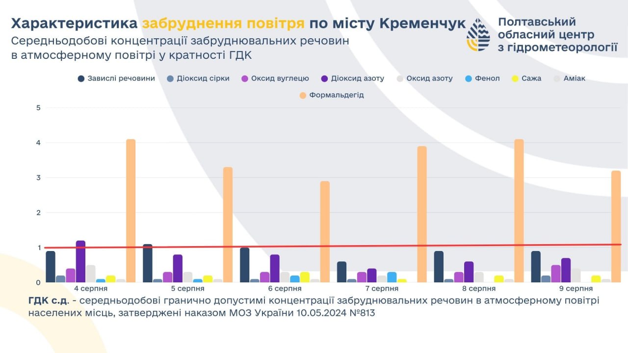 Полтавський обласний центр з гідрометеорології оприлюднив дані щотижневого моніторингу якості повітря у Кременчуці. У період з 4 по 9 серпня проби відбирали на чотирьох стаціонарних постах по вул. Молодіжній, вул. Івана Приходька та біля зупинок «Центральний ринок» і «Кредмаш».