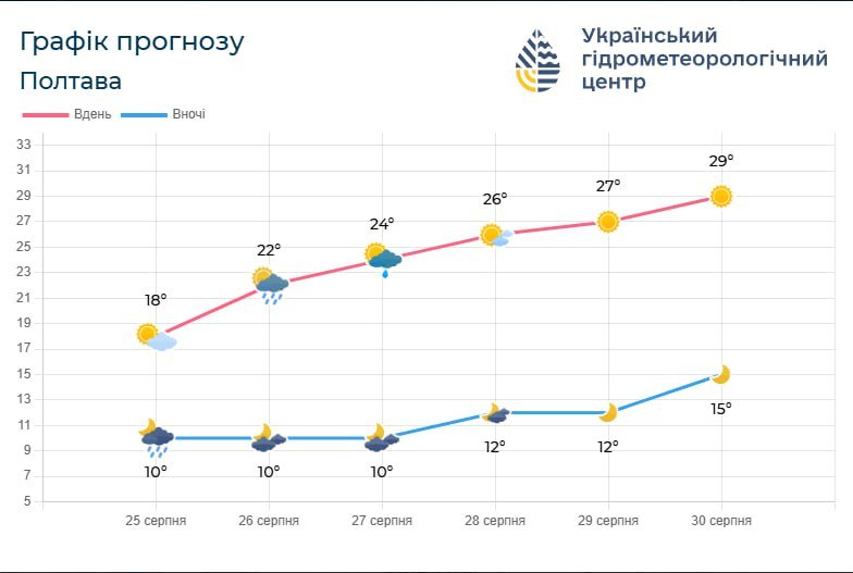30–31 серпня — без опадів. Вночі +13…+18°, вдень +25…+30°.