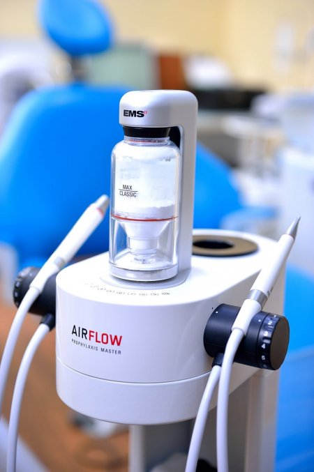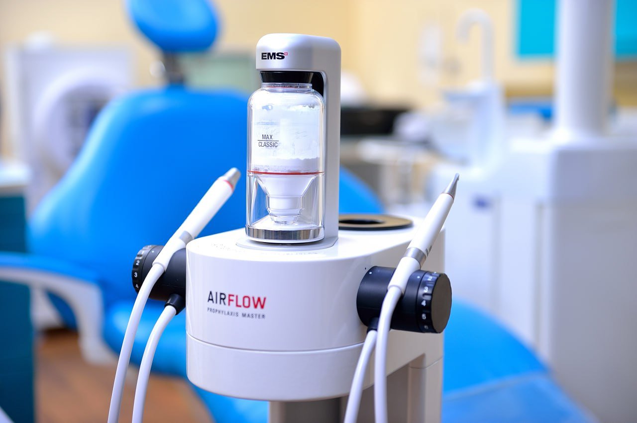 AIR FLOW очистить ваші зуби до стану «нуль бактерій» без механічного контакту інструментів з поверхнею зубів: емаль очищається водно-повітряним струменем зі спеціальним порошком. Результат процедури — чисті блискучі зуби.