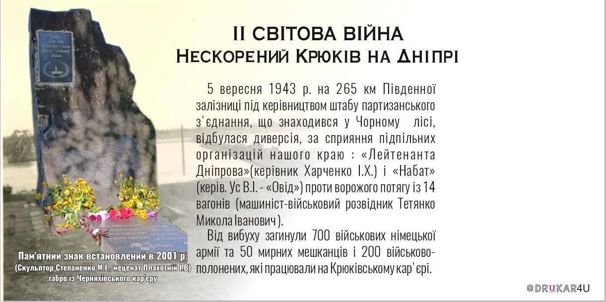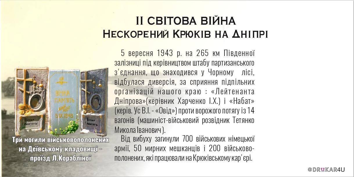Тоді під керівництвом штабу партизанського зʼєднання, що знаходився у Чорному лісі, за сприяння підпільних організацій нашого краю: «Лейтенанта Дніпрова» (керівник Харченко І.Х.) і «Набат» (керів. Ус В.І. — «Овід») відбулася диверсія, проти потягу із 14 вагонів (машиніст-військовий розвідник Микола Тетянко).