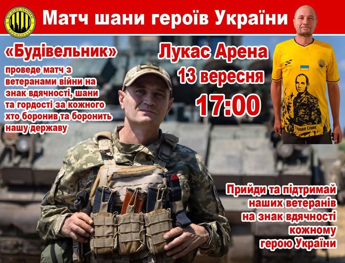 У Кременчуці на «Лукас Арені» відбудеться Матч шани героїв України. ФК «Будівельник» проведе матч із ветеранами війни.