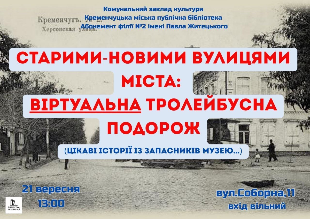 Кременчуківців і гостей міста кличуть цієї неділі на незвичну екскурсію — віртуальну подорож тролейбусними маршрутами № 5 та № 3Б. Захід організовують працівники міської публічної бібліотеки та краєзнавчого музею.