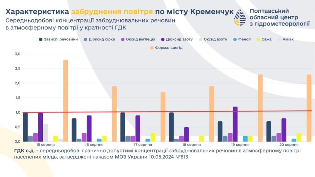 За даними Полтавського обласного центру з гідрометеорології, протягом тижня у місті фіксували перевищення середньодобових гранично допустимих концентрацій (ГДК с.д.). Найбільші відхилення стосувалися формальдегіду — його рівень був завищений щодня. Крім того, 19 вересня зафіксували перевищення норми діоксиду азоту.