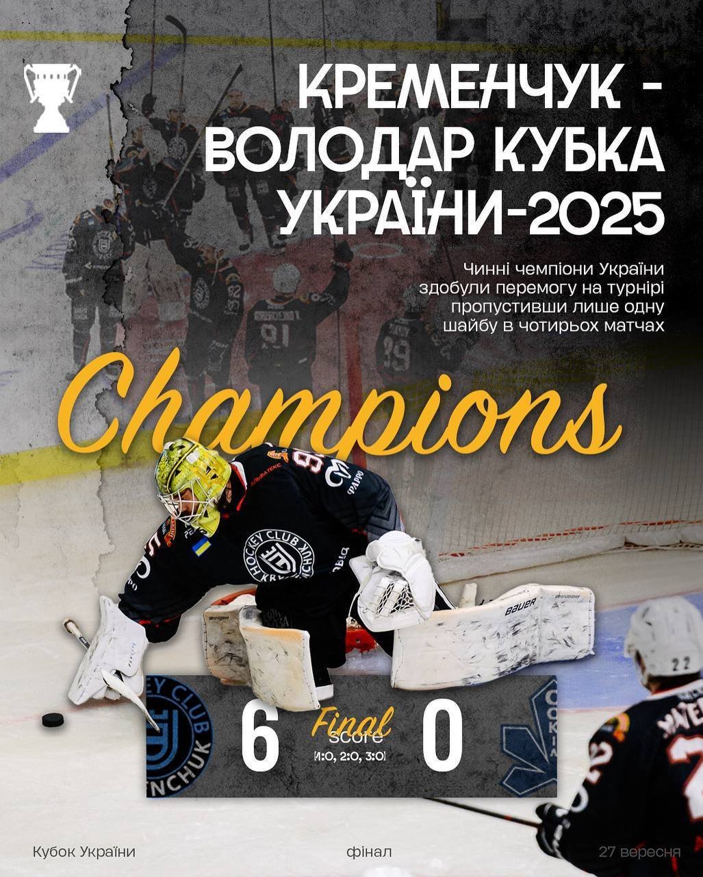 Сьогодні, 27 вересня, ХК «Кременчук» у фіналі розгромив «Сокіл» із рахунком 6:0 (1:0, 2:0, 3:0). Про це повідомила Федерація хокею України.
