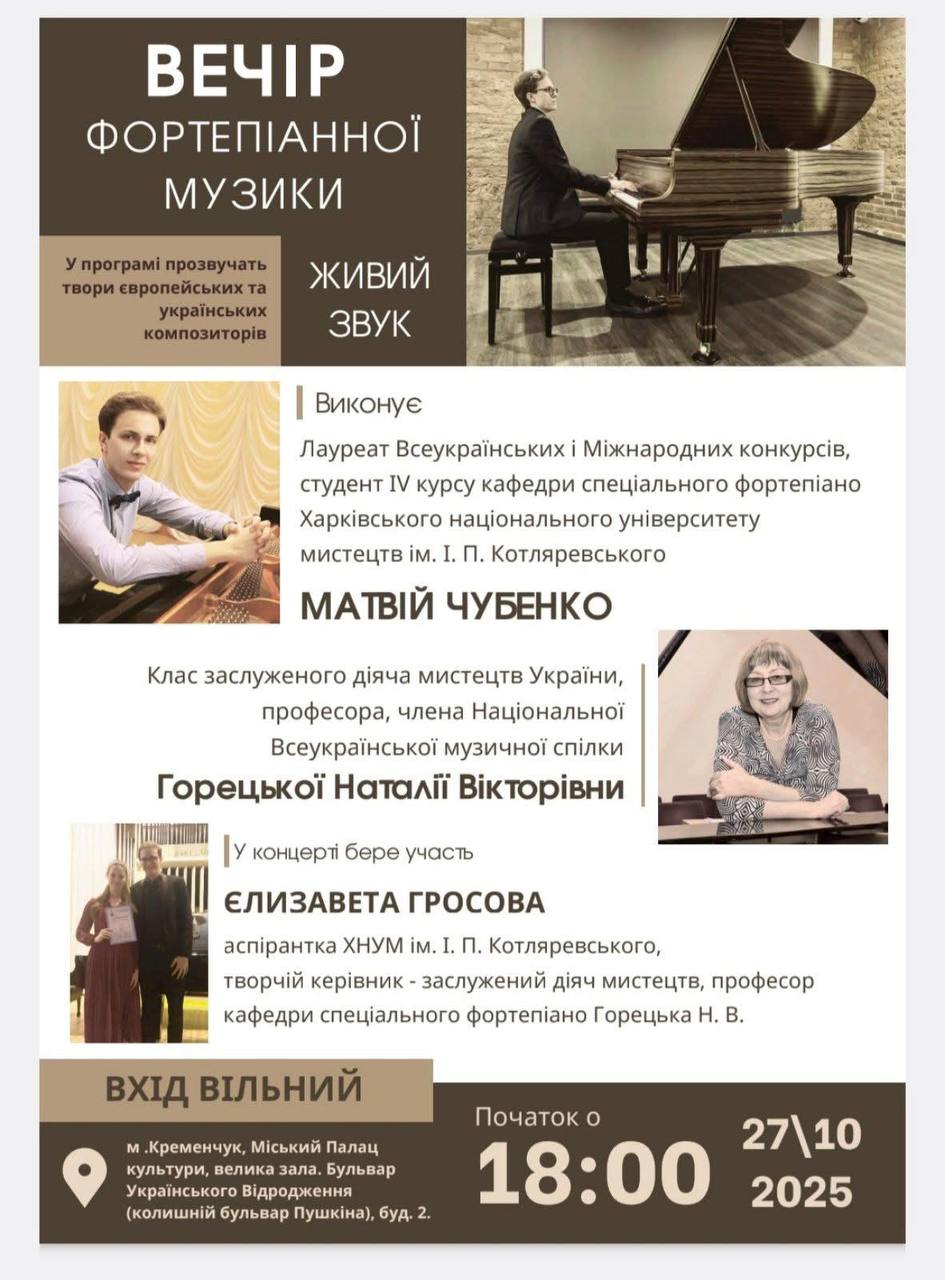 У програмі прозвучать твори європейських та українських композиторів у виконанні Лауреата Всеукраїнських і Міжнародних конкурсів, студента IV курсу кафедри спеціального фортепіано Харківського національного університету мистецтв ім. І. П. Котляревського МАТВІЯ ЧУБЕНКА (клас заслуженого діяча мистецтв України, професора, члена Національної Всеукраїнської музичної спілки Горецької Наталії Вікторівни).