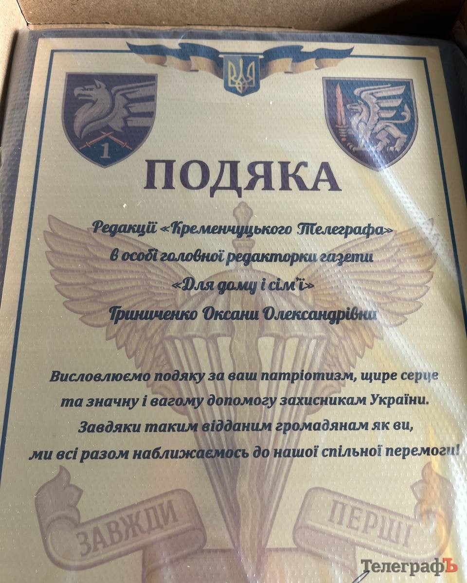 Головна редакторка газети «Для дому і сім’ї», журналістка «Кременчуцького Телеграфа» Оксана Гриниченко отримала подяку від 1-го аеромобільного батальйону 81-ша окремої аеромобільної Слобожанської бригади за патріотизм, щиру підтримку та допомогу українським захисникам.