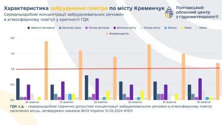 Полтавський обласний центр з гідрометеорології оприлюднив дані про стан атмосферного повітря в Кременчуці за період з 20 по 25 жовтня.