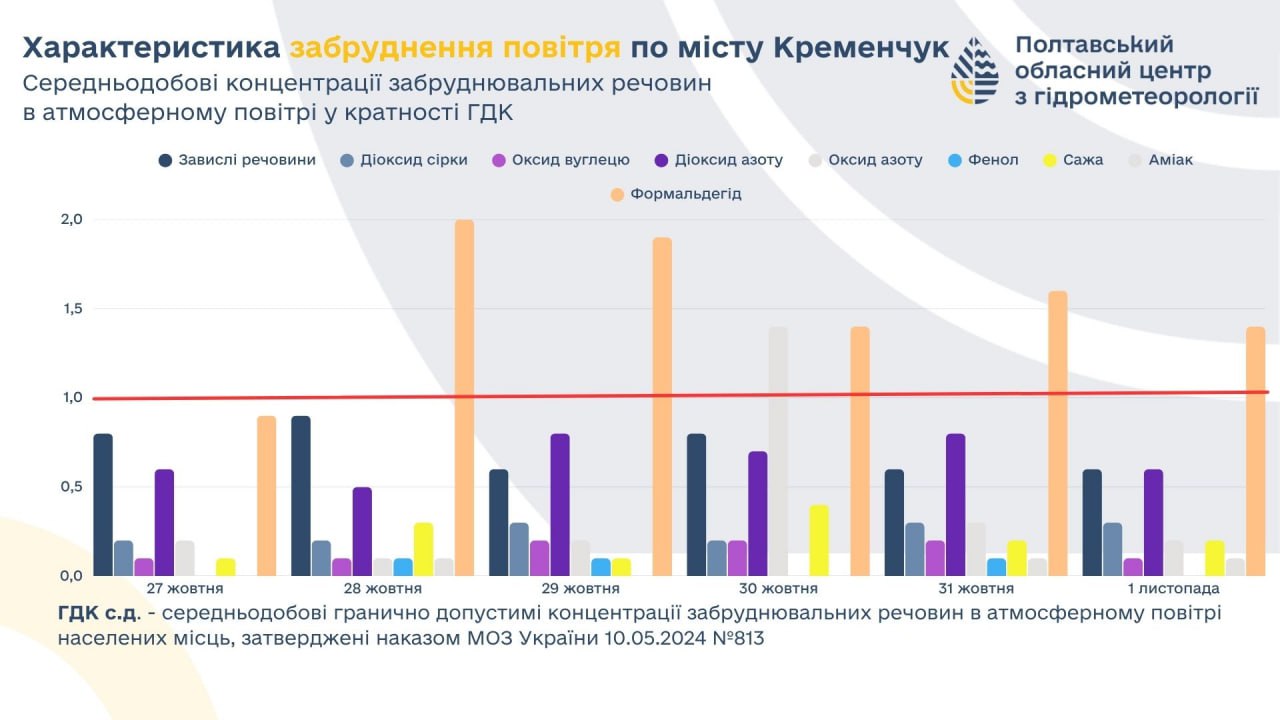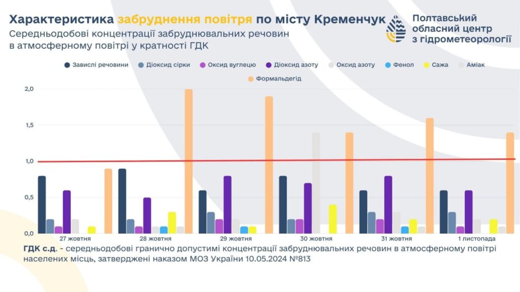 За результатами аналізу, середньодобові концентрації більшості шкідливих речовин у повітрі залишалися в межах норми. Водночас рівень формальдегіду у цей період перевищував середньодобову гранично допустиму концентрацію (ГДК) — із 28 жовтня по 1 листопада.
